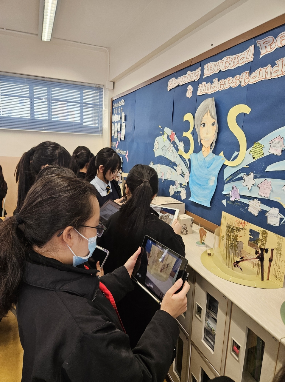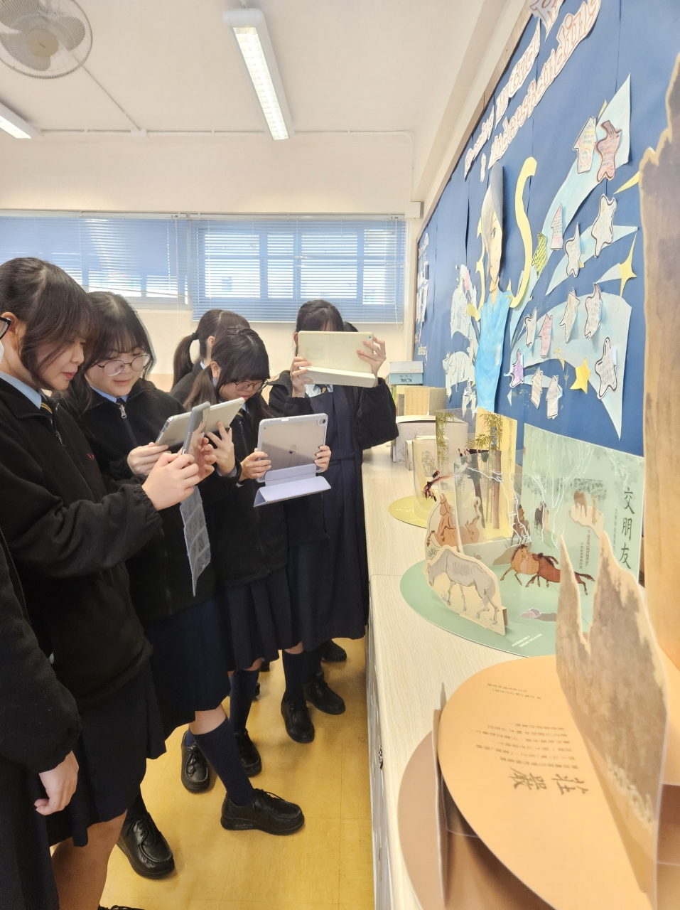 Our Secondary 3 students participated in the “Knock Knock Memory” thematic workshop supported by the Jockey Club. Through the interactive AR platform “Roaming Landscapes”, they stepped into the ideal world depicted in “Peach Blossom Spring”, exploring how architecture—ancient and modern—embodies human dreams and cultural values.During the workshop, students actively engaged with tablets, scanning pop-up books and thematic displays to immerse themselves in virtual landscapes and architectural scenes. Combining literary analysis with creative design, they envisioned and constructed their own “ideal architecture.”This experience not only deepened their understanding of classical Chinese texts, but also inspired reflection on the relationship between modern society and imagined utopias.